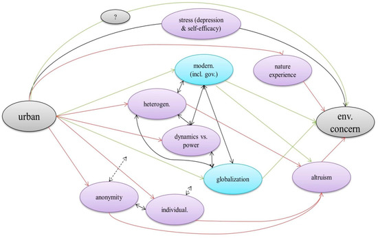 Theoretical path model. Representation includes the main, theoretically relevant pathways. Purple indicates more “traditional” and bluer more “southern” mediators of the urbanization-concern link. Green arrows indicate expected positive contributions to the overall effect, red arrows show expected negative contributions, and black illustrates unclear effect signs that are independent of cultural context.
