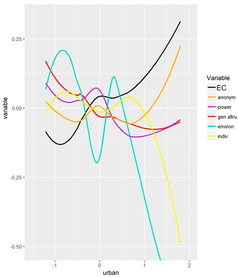 We further found that individualism neutralizes anonymity’s positive contribution by a negative mediation overall (Figure 4). Individualism positively influences EC because of mutually positive feedback between the two traditional constructs (which is expected); however, individualism robustly decreases in both urbanization and modernization. This neutralization can be explained by cultural relativity in regard to crowding’s psychological consequences and by the relational independence that could be replacing collectivism in India [37]. Once again, we thus find positive reinforcement of traditional urban features by the Indian notion of southern ones, rather than negative. In the aggregate, it is possible that we will observe positive contributions by individualism if the anonymity sign changes at later urbanization stages. This is, however, conditional on the comparative magnitudes of other feedback mechanisms, much like on culturally relative notions of anonymity.
