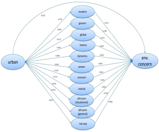 Very few superfactors emerged that were not aggregated: The two different altruism levels, as well as distance to city center as an element of urbanization, and one single dimension featuring both nature experience and power, all entered the model separately to facilitate interpretation. As opposed to this, only in the case of heterogeneity was no evidence found for the hypothesized factor in the data. However, including inequality separately contributed to an increasingly realistic model given that, despite mutual dependence (e.g., [16]), the literature featured slightly different paths to and from each of these constructs (e.g., modernization [61]).