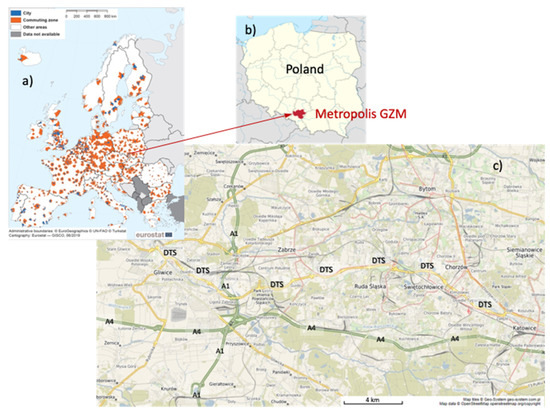 (a) Cities and commuting zones in Europe (2018); (b) location of Metropolis GZM in Poland; (c) route of main roads in Metropolis GZM.