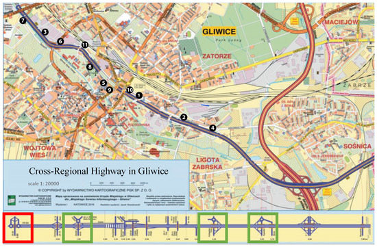 The construction plans of the DTS in Gliwice provoked much controversy among the citizens. The concerns were mainly related to the increase in car traffic in the city centre, the emission of pollutants from vehicles and transportation noise. The chosen solution in Gliwice was a road of 8.1 km in length that included (1) a single-carriageway with four lanes, (2) a dual carriageway with two lanes and (3) a dual carriageway with three lanes in each direction [31]. Limiting the “circulation” along the city road network became possible due to the dense distribution of road junctions. The section in Gliwice includes 16 road junctions, located every 1.3 km on average (Figure 2) [31]. The two turbo-roundabouts at one sampling point are shown in red, while conventional roundabouts are shown in green.