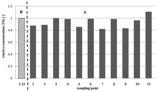 To find out whether and how the construction of the DTS through the city centre affected the quality of the air in the vicinity of the newly opened road, the 24 h concentrations of NO2 were determined at each sampling point. The mean of the 24 h concentrations was obtained before and after DTS construction (i.e., the (B) and (A) measurement periods, respectively). These concentrations were used to evaluate the impact of changing the traffic organisation on ambient air quality. For this purpose, the concentrations measured after putting the DTS into use (A) were compared to concentrations determined at the same sampling points before the construction of the DTS in the city (B). Assuming the concentration (B) period to be 1.0 for all sampling points and comparing the concentrations from period (A), we obtain the relative concentrations presented in Figure 3.
