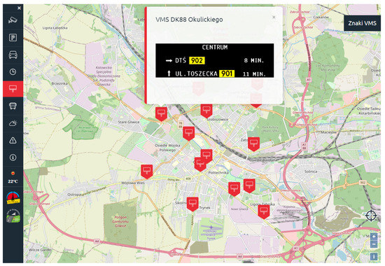 From the perspective of several years of using the DTS, the authorities of Gliwice City consider that the DTS road meets expectations. Residents use this road, and the traffic on the DTS is growing. In 2016, the number of cars passing through the tunnel was about 30,000 per day. Current usage, on an average working day, is 37,000 cars [74]. This means that more and more people are choosing DTS instead of going through the city. This effectively reduces traffic in the city centre. The new road is also used by patients of the Institute of Oncology in Gliwice. It is crucial for an institution of such importance to have the right access roads. Road connections to many other places in Gliwice have also been improved, including the Silesian University of Technology and the subzone of Katowice Special Economic Zone [75]. There are several traffic solutions in the city, which play a significant role in changing the habits of the residents (who now choose DTS more often than local roads). There is also the unique (in eastern Europe) intelligent traffic control system (ITS Gliwice), which, by the signs with variable content, provides information about the time of arrival to the city centre (Figure 5). The system optimises traffic in Gliwice and ensures a fluent passage in a shorter time. The additional innovation of ITS in Gliwice is to give public transport buses the priority of passing through crossings with traffic lights. Based on the same devices, a system gives absolute priority to privileged vehicles (police, ambulance and the fire brigade).