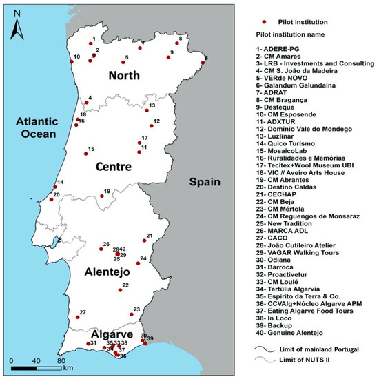Taking this into consideration, the CREATOUR Project (Creative Tourism Destination Development in Small Cities and Rural Areas), included, from November 2016 to June 2020, a total of 10 organizations which were monitored in the northern region; it also included another 30 organizations from another three regions of mainland Portugal (Centre, Alentejo and Algarve—Figure 2). The project focused on four regions. The areas of Porto and Lisbon were not considered in the project as they are highly urbanized areas, are commonly associated with mass tourism, and have been considered priority destinations in the national strategies designed for the tourism sector. It is the first time that this kind of project and analysis specifically concerned with creative tourism occurs in Portugal and focuses on small cities and rural areas, which are also the territories with more relevant intangible heritage, which is being lost with time.