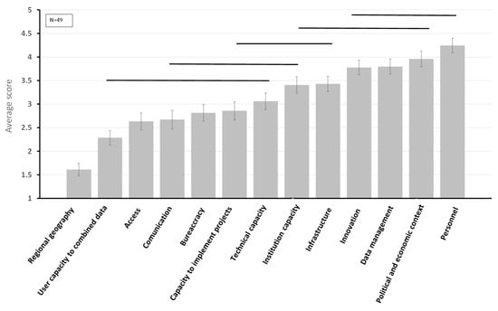 Average scores of factors limiting the use of EO data: 1 = least important, and 5 = most important; error bars = standard error of the mean; horizontal bars represent five homogeneous subsets from the statistical analysis (details presented in Table 2).