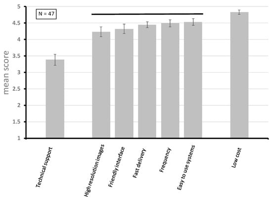 Average scores of the user needs/expectations of EO data providers: 1 = least important, and 5 = most important; error bars = standard error of the mean; horizontal bar represents a homogeneous subset from the statistical analysis (details presented in Table 3).