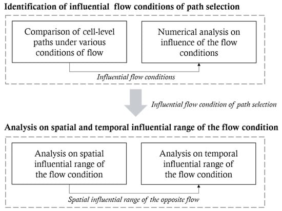 The framework for the current research consists of two parts: (1) identification of influential flow condition of path selection through macroscopic analysis (Section 3.1) and (2) analysis on the spatial and temporal range of the flow condition (Section 3.2). In the first subsection, the path planning behavior’s influential flow conditions are identified by comparing paths under different flow conditions. In the second subsection, the spatial and temporal influential ranges of the flow condition are analyzed. Figure 1 summarizes the overall process of the proposed analysis framework.