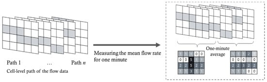 The subject pedestrian data are selected and used to analyze the path planning behavior of subject pedestrians. The remaining trajectory data are used to generate flow data to represent the subject pedestrians’ dynamic walking environment. Following the space configuration, we present the trajectory data as an ordered set of consecutive cells, as shown in Figure 2. The direction of flow is defined as N-S-E-W, and each directional flow rate is measured for each cell every minute.
