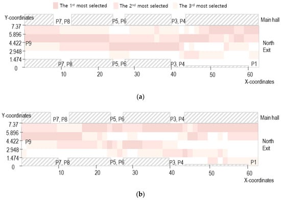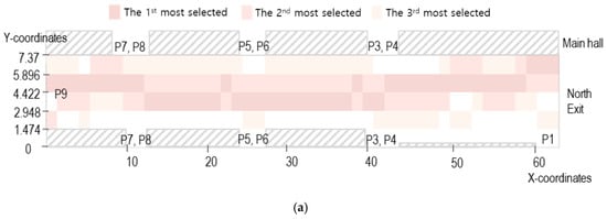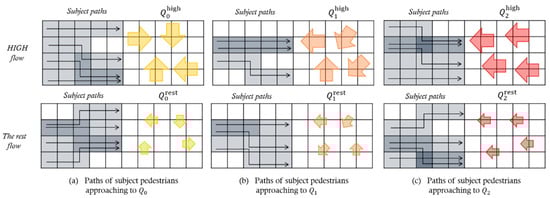 Some literatures on path planning behavior of pedestrians have showed that one of the main factors of the behavior changes is the high flow [,]. To investigate the influence of the opposite flow on the path planning behavior with the empirical data, we compare paths selected by subject pedestrians when they face different flows as described in Figure 3. In this study, when preprocessing the pedestrian trajectory data, we classify the flow distribution into four levels: High flow (75th percentile), Mid-high flow (50th percentile), Mid-low flow (25th percentile), Low flow (the rest). Then, we grouped Mid-high flow (50th percentile), Mid-low flow (25th percentile), and Low flow (the rest) as the normal flow group. If the flow rate is beyond the 75th percentile of flow distribution, we classify it as a high flow rate, if not, it is considered as others. The criteria for classification can be changed according to the analysis purpose. If the pedestrian behavior in more extreme situations needs to be observed, the criteria can be adjusted to be higher. From the dataset used, the 75th percentile values of the average flow rate on the entire central aisle are 15.65 (peds/), 5.52 (peds/), and 4.14 (peds/). We use the three most frequently chosen cells among the five cells belonging to each column to determine each case’s frequently chosen paths.