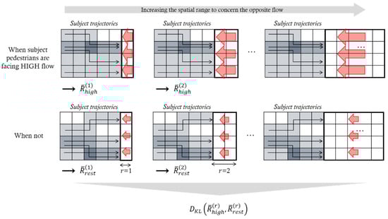 To investigate the spatial influential range of the opposite flow, we define the flow conditions , where the superscript indicates the range of pedestrians as shown in Figure 5. Then, we define , , and for each flow condition . The shows the level of path changes under the high flow rate of compared to the rest of the flow rate.
