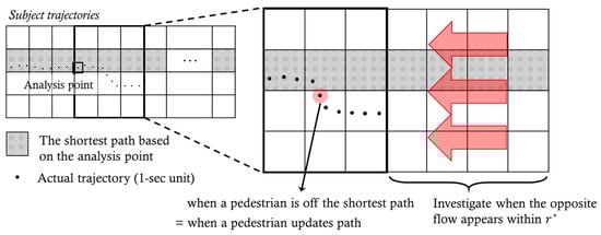 Next, we propose a method for identifying the temporal influential range with a given flow condition and its spatial influential range, as illustrated in Figure 6. We assume that pedestrians prefer the shortest path, and they update their paths outside a certain range from the shortest path when they face the opposite flow. From the relationship between the time of opposite flow and the time of updating path, we can remark that the opposite flow is a factor that makes pedestrians update their paths. In addition, we can find the temporal influential range of the flow. Here, we set the pedestrian’s destination to the last point of his/her trajectory, and then the shortest-distance path can be obtained.