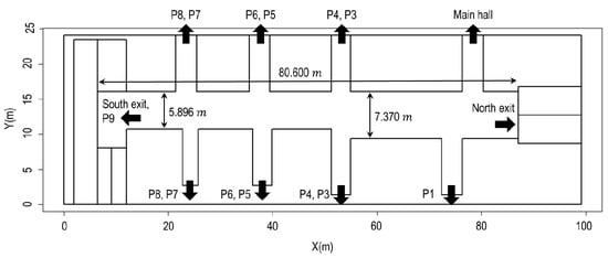 The dataset was collected in the west passage of the Lausanne train station on 27 February 2013. It was collected by a large-scale network of infrared and depth sensors deployed in the station. The west passage is the main passage of Lausanne station connecting to major cities in Switzerland, often crowded with many pedestrians. Figure 7 shows the layout of the data site. This study’s analysis region is the central aisle. The central aisle is connected to the North exit, Main hall, platforms, and South exit from the right side to left side. The length of the aisle is 80.6 and the width of the aisle is 7.370 on its first half and narrows to 5.896 on the second half.