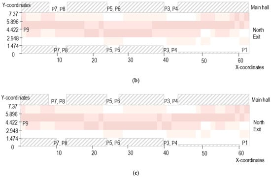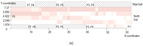 The paths frequently chosen in high flow are shown in Figure 8, and the paths frequently chosen in the other cases are shown in Figure 9. The subject pedestrians tend to move from the upper-right to the middle-left side since they are heading towards the South exit or P9 from the main hall. In other cases, the difference is negligible between the paths chosen by subject pedestrians when facing . From Figure 9, one can notice that pedestrians usually walk to the center of the aisle when they leave the main hall and walk straight. However, as the flows become high, the subject pedestrians tend to stick to the right wall for a longer time immediately after leaving the main hall, regardless of the flow directions. Furthermore, this tendency gets more evident in the order of . The results show that if the proportion of the opposite flow is high, there are more changes in the path selection decision.