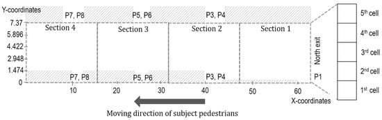 For the walking space’s configuration, we divide the walking space into cells, in which the size is set to the average walking distance for one second. Then, a section is defined as the group of cells in m columns and rows. The path selection behavior of pedestrians is numerically measured and compared based on the section.