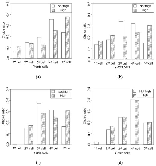Bar plots in Figure 11 show two distributions of the mean probability of cell selection in each row. The white bar plots represent the pedestrians facing high opposite flows, and the gray bar plots show the remaining cases. In the first section, pedestrians often choose the 4th cell and the 5th cell since they enter the central aisle through them. In particular, when there is a high opposite flow, many pedestrians select the upper cells to move along the right wall. One can see from Table 2 that the value of Section 1 is the second largest among the four sections, which indicates that the difference in path choice behavior is relatively high when pedestrians face high flow and when they do not. Next, in Section 2 and Section 3, pedestrians tend to pass through the center of the aisle when the opposite flow is not high, and they tend to move along the right wall when the opposite flow is high. values in Table 2 show that the difference in path selection behaviors with respect to the rate of the opposite flow is the largest in Section 2. Lastly, there is no significant difference in path selection behaviors concerning the opposite flow in Section 4, as seen in Figure 11d and values in Table 2.