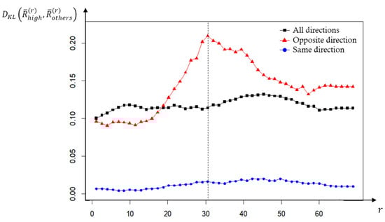 where and in (3) and (4) are the probability distribution that subject pedestrians choose the cells in the row. Using and , we measure the difference in the distribution of the cell choice under high flow conditions and the rest of the conditions in Kullback–Leibler divergence,. Figure 4 shows how the rate of cell choice and are obtained. The difference of pedestrians’ statistical behaviors between different opposite flow rates can be measured by which is defined as