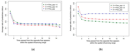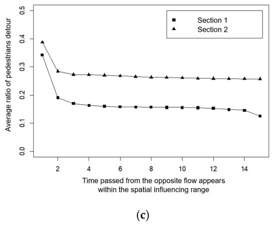 The results are shown in Figure 13. In the first section, the ratio of the pedestrian updating his/her path within 1 s after the opposite flow appears within is between 0.3 and 0.4, and the ratio falls below 0.2 after 2 s. The 2nd section has a higher rate of path update than the 1st section and, as the opposite flow rate increases, the path update ratio also tends to increase. Moreover, the path update’s temporal range is analyzed to be 2 s, as in the 1st section. We can see that pedestrians are affected by the opposite flow and updated their paths within 1 to 2 s.