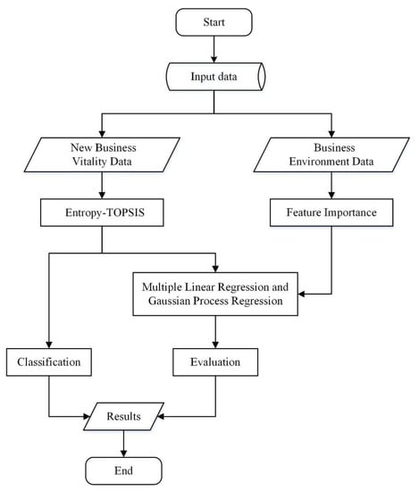 The Technique for Order Preference by Similarity to an Ideal Solution (TOPSIS) is a multiple-criteria decision-making (MCDM) method proposed by Hwang and Yoon []. TOPSIS provides reliable decision-making in multiple fields, such as business and marketing management [,], energy management [,], land use [], and air quality []. The weighting method includes a subjective weighting method and an objective weighting method. Subjective weighting methods, like the Delphi method, direct rating, and simple multi-attribute rating techniques, etc., are affected by the subjective views of researchers. As an objective weighting method, the entropy method completely relies on the calculation of original data and can provide more accurate weights than the subjective method. TOPSIS makes full use of attribute information and does not require attribute preferences to be independent []. TOPSIS does not have strict restrictions on the number of indicators, sample size, or data distribution, and can provide reliable evaluation results through simple calculations []. For some complex MCDM methods, the sample should be large enough and the calculation process is cumbersome, which is not suitable for the small sample case of this research. Therefore, this article chose the Entropy-TOPSIS method from a variety of MCDM methods to evaluate the new business vitality of 29 Chinese cities.