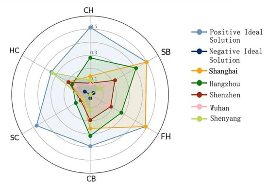 Table 6 shows the evaluation results of the new business vitality of 29 Chinese cities based on the Entropy-TOPSIS method, which could be divided into five categories (Table 7). In order to see the differences in the five categories more clearly, we select one city from each of the five categories to make comparisons with the positive and negative ideal solutions (Figure 2). Table 2 and Table 6 reveal the single and comprehensive rankings of the six new business indexes of the 29 cities, respectively. The classification results also reveal the following.