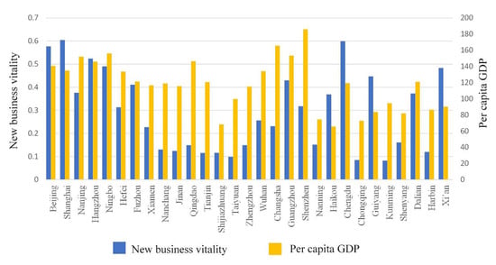 The last 30 years have seen the fastest pace of urbanization in the world. On the one hand, with the introduction of various new urban concepts, the study of relevant city indexes has attracted much attention, such as the Eco-City Index [,,], Green City Index [,,], Livable Cities Index [,], Compact City Index [,], Smart City Index [], Resilient City Index [,], Innovative City Index [,], Global City Index [,], etc. For example, Jin [] used a factor analysis method to evaluate the economic vitality of 50 cities in China from aspects of economy and its growth, number and income of enterprises, income of residents, financial and social security, foreign trade and capital, level of technology and education, and environment. He concluded that urban benefits and production are the main factors of the economic vitality. On the other hand, with the cyclical development of prosperity and the decline of cities, the Sustainable City Development Index [,] and Urban Competitiveness Index [] have been widely paid attention to. For instance, Wang et al. [] evaluated the urban innovation competitiveness based on five categories of indicators, i.e., innovation basic competitiveness, innovation environment competitiveness, innovation input competitiveness, innovation output competitiveness, and innovation and sustainable development competitiveness. However, in existing studies of various city indices, the urban new commercial index has not attracted enough attention. By studying this new business index, the purpose of this article is to address the following questions: (1) How can one quantitatively measure the vitality of a new commercial space? What are the advantages and disadvantages of each city in the development of new business forms? (2) What is the relationship between the vitality of a new business space and the business environment? What factors have more important effects on a city’s new commercial vitality? (3) How can one enhance the vitality of a new business space and reshape its characteristics by optimizing the business environment? The business environment is the soil for the survival and development of enterprises. Optimizing the business environment will support the growth of enterprises, promote economic development, and improve the level of cities [,,,,]. According to the World Bank’s “Doing Business 2020”, China, as the world’s second-largest economy, ranks 31st among 190 economies in the ease of doing business. China’s business environment still has much space for improvement. To this end, we propose the following three hypotheses: (1) Hypothesis I: The new business vitality is highly correlated with the business environment factors. (2) Hypothesis II: The human capital has a more important effect than economic development level on business vitality. (3) Hypothesis III: Cities with higher GDP have a higher urban vitality index.