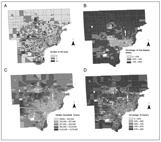 Neighborhood distribution maps for the DMA of housing discrimination cases (A), percent non-Hispanic whites (B), median household income (C) and percent of homeowners (D).