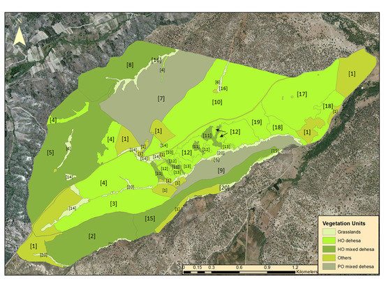 A physiognomic delimitation on a 1:1.000 scale of the different plant formations present in the reserve was developed, obtaining a series of plots or tesserae, which were assigned to general vegetation units, through geographic information systems (GIS), with the ArcGIS® 10.1 software package. This theoretical and practical delimitation in different plots was conducted following physiognomic and ecological criteria by means of the main plant formations and making reference mainly to the tree types [18,19]. The predominance of holm oak or Pyrenean oak in the mixed dehesas was established on the basis of a greater abundance of one or the other species, which was defined in at least 60% of the trees present in each vegetation unit. The characterization of the territory from an ecological point of view was completed by assigning the different vegetation units to habitats defined by the European Union [19,20], for future management activities in the study area.