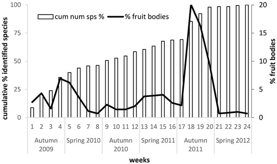 Number of species identified (cumulative %) and of fruiting bodies (in % of total) during 2009–2012.