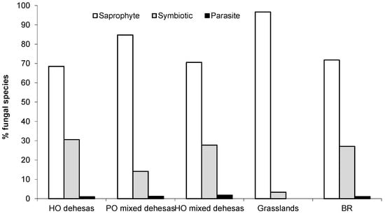 Analysis of the way of life in the area studied showed a notable predominance of saprophytic (72%) over symbiotic (27%) and, in a residual way, parasitic (1%) species. Other studies carried out in Mediterranean ecosystems dominated by various species of the genus Quercus [40,50] indicated lower percentages of saprophytic species, which could reflect the influence of livestock numbers on the presence of taxa with this lifestyle. This representation did not show great variations with respect to the different units of vegetation studied, with slight percentage variations in the holm oak dehesas and the mixed holm oak and Pyrenean oak in the presence of symbiotic species or otherwise in the oak grove, except in the grasslands, with a notable presence of saprophytic species (Figure 3). Centuries-old and extensive livestock use could have conditioned the large percentage of saprophytic taxa present in all the habitats considered, especially in the grasslands where livestock use was even greater, as indicated by the presence of various coprophilic species, such as the genera Coprinus Pers., Coprinopsis P. Karst., or Panaeolus (Fr.) Quél. [51].