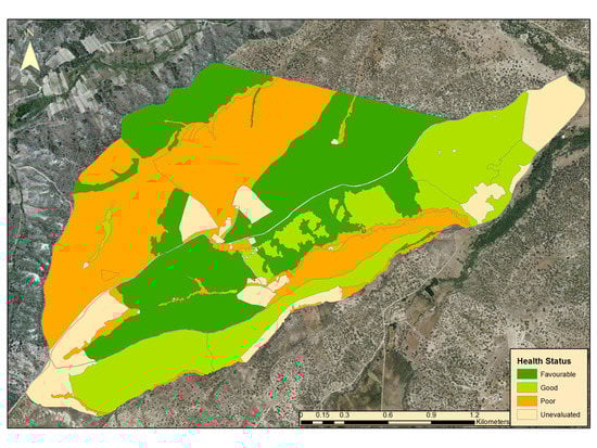 The evaluation of the conservation status within each of the physiognomically defined plots in the study area was based on three parameters. The results are summarized in Table 4. The first one, the health status was estimated taking into account the way of life of each of the species and the proximity to the indicators referred to by Moreno [29]. The evaluation of this parameter made it possible to estimate that more than half of the plots in the reserve presented a good or favourable health status (59.7% overall), although it should be noted that no plot was catalogued as “optimal” state (Figure 4). There could again be an influence of the livestock load in the years prior to the study on the increased presence of saprophytic taxa [52], and the low representativeness of good or optimal plots according to the lifestyle of the fungal species.