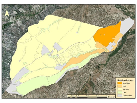 With regard to fungal diversity, based on the number of species, it was observed that only 7% of the plots had a very high or high number of species (Figure 5), with the percentage of plots with a medium amount (50.9%) being notably higher, and even for those with a low number of species (42.1%). The greatest diversity of taxa was found mainly in the eastern part of the reserve. The use of fungal diversity in plots of the same area to assess their state of conservation has been shown to be useful [56].