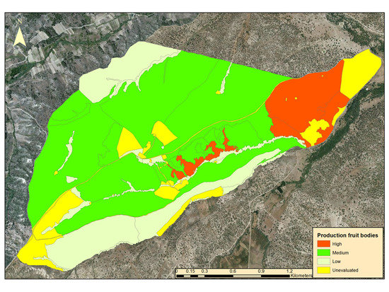 The last parameter, the number of sporocarps counted, showed that approximately half of the plots analysed (49.1%) had a low number of specimens, only 10.5% with an abundance of fruiting bodies, leaving the rest with a medium number (Figure 6). These results generally indicated a greater number of fungal specimens in the holm oak dehesas, mainly in the eastern part of the area studied. This parameter was mainly used in ecological succession studies after fires [57], since in mature plant formations it is not usually considered a very relevant parameter [31].