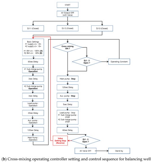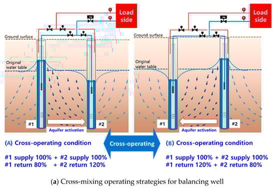 Figure 2b demonstrates a flow chart depicting the balancing well cross control method. When the circulating water is supplied from the underground heat exchanger (A) and the intermediate heat exchanger (B) performs heat exchange and is returned, 120% of the circulating water is returned to the underground heat exchanger (A-Zone), and the remaining is used in another underground heat exchanger (B-Zone). This system activates the aquifer by forming a groundwater level difference, and bleeding and recharging are controlled to alternately operate the system according to the set cross-operation cycle.