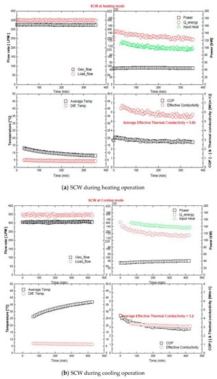 Figure 4a,b shows the result of the flow rate of the water circulated to the SCW ground heat exchangers without any cross-mixing operating in heating and cooling modes, the difference in the average temperature of the ground and the temperature of the I/O, the amount of heat injection heat to the power used by the system, the power and ground of the equipment, and the instantaneous effective heat conductivity and COP. Unlike the cross-mixed balancing well ground heat exchanger, the SCW ground heat exchanger was operated by injecting 150 LPM of water into the two holes on the ground. An experiment was performed to obtain the difference between this operation method and the balancing well cross-mixing method. The trend in Figure 2 shows a trend similar to that shown in Figure 1. However, the results of the effective heat conductivity of the two systems were contradictory as compared with the cross-mixed balancing well underground heat exchanger of Figure 1. This is because the cross-mixed balancing well method enables an active heat transfer owing to the changes in the recovery flow rate and activation of groundwater flow, while the SCW method does not actively intersect the underground water flow. The possible reason is that groundwater flow has not been activated because it maintains the same level.