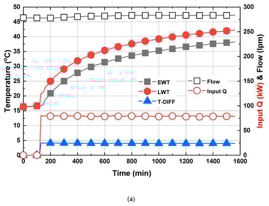Figure 8 shows the results of variation in temperature against the measured time Ln (natural log) to evaluate the thermal performance of the SCW ground heat exchanger; the graph is used to obtain the slope of Equation (3). Figure 8a,b presents the thermal load status on the load side in the heating and cooling modes, respectively. The average effective thermal conductivity values of the heating and cooling modes are 5.86 and 3.19 W/mK, respectively. However, the heating mode shows appropriate thermal performance than the cooling mode. From the results of Figure 8b, it is determined that thermal performance is degraded due to heat accumulation by the increase in the temperature of the circulating water on the geothermal side. The results shown in Figure 8a are assumed to be due to the alleviation of heat accumulation caused by the lower circulated water temperature on the geothermal side.