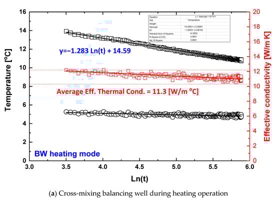 Figure 9 presents the result of variation in temperature against the measured time Ln (natural log) to evaluate the thermal performance of the balancing well underground heat exchanger; the graph is used to obtain the slope of Equation (3). Figure 9a,b shows the thermal load status on the load side in the heating and cooling modes, respectively. The slopes of the two modes show conflicting forms caused by the different conditions of the heating and cooling modes. Here, the slope of the temperature over this calculated time was −1.283 and 1.209, respectively. The effective thermal conductivity values using the line-source expression show the values of 11.3 and 16.2 W/mK, respectively, during the heating and cooling modes. These results demonstrate the opposite tendency of the results in Figure 5. The mean effective thermal conductivity shown in Figure 9a indicates a tendency for the value of Figure 9b to be large. The possible reason is due to the energy flowing from the outside owing to the low temperature underground water flow along with circulation of water from the well to the low well, which is higher than the natural water level, due to different water levels.