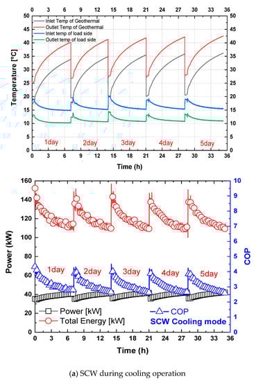 Figure 10 shows the temperature distribution of the inlet/outlet (In/Out) on the geothermal and load sides and the total power used and the energy of the SCW ground heat exchanger. Finally, a COP analysis was performed for each mode. Consequently, the heating mode demonstrated in Figure 10b reveals a stable increase in the change in the ground initial temperature as compared with the SCW cooling mode demonstrated in Figure 10a.