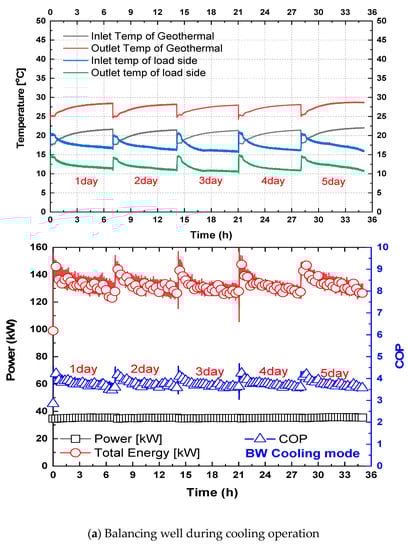 Using a cross-mixed balancing well underground heat exchanger, a COP analysis was performed by comparing the temperature of the ground In/Out and In/Out for the heating and cooling modes, as well as the amount of power used to operate the system. The results are shown in Figure 8, which shows characteristics similar to those shown in Figure 10. However, the comparison of the temperature distribution characteristics of the underground and load sides under cooling conditions in Figure 10a and Figure 11a demonstrate that, in the case of SCW ground heat exchangers shown in Figure 10a, the cyclical water temperature on the ground increases more as compared with the cross-mixed balancing well underground heat exchangers shown in Figure 11a. Meanwhile, the cross-mixed balancing well heat exchanger shows that the temperature of circulating water on the ground does not increase rapidly. This is due to the activation of the underground aquifer by water level difference owing to the difference in the number of cycles returned to the two wells when using the cross-mixed balancing well. In addition, the improvement of the flow of the underground aquifer to improve the efficiency of the heat exchanger and the ability to recover the temperature of the underground circulating water is considered to be the causes of this increase. Hence, it is believed that heat transfer performance can be improved by disturbing the physical fluids and optimizing the amount of water in the pit through the control of the water level difference and cross operating by utilizing the underground heat exchanger applied with the cross-mixed balancing well technique. Furthermore, these technologies, along with the application of groundwater filtering devices, are expected to prevent dust.