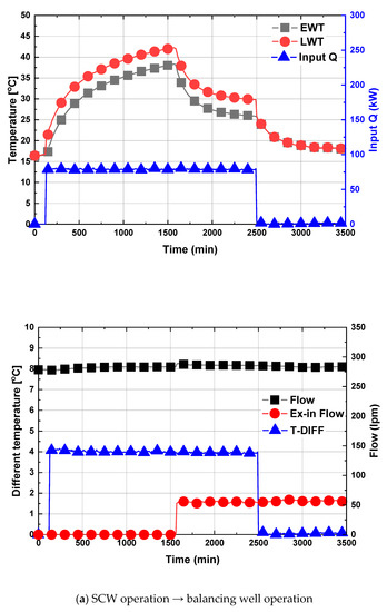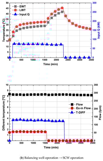 Figure 12 shows the results of analyzing the thermal environment characteristics of the ground water through the cross mixing of the SCW and balancing well methods. Figure 12a shows the characteristics of the circulating water intake temperature, circulation flow rate, bleed flow rate, input and exit temperature difference, and injected heat caused by the change to the balancing well method from the SCW method after 24 h of operation. The SCW method initially shows a continuous increase in the temperature of the In/Out during operation. However, utilizing the SCW method instead of the balancing well method results in a decrease in temperature difference between the inlet and out temperatures of the circulating water. The possible reason is the activation of the underground aquifer by the water level difference of the well by the injected bleed flow and the activation of the flow of the underground aquifer. Consequently, the temperature recovery of the underground circulating water might increase. Figure 12b shows the results of the circulation water temperature, circulation flow rate, bleed flow rate, and injection heat, due to utilization of the SCW method, instead of the balancing well operation, after 24 h of operation. When operating the balancing well method, the temperature difference between the inlet and exit temperatures of the circulating water is observed to be slightly higher than that shown in Figure 12a. However, when changing from the balancing well method to the SCW method of operation, the temperature of the In/Out increases rapidly. Through this technique, it is deemed that the heat accumulation phenomenon occurred because of the increase in the temperature of the circulating water in the ground. As shown in Table 4, when driving balancing well, the thermal efficiency increases more than that of the SCW, and the thermal environmental conditions of the ground water are optimized, which can be a condition for long-term operation.