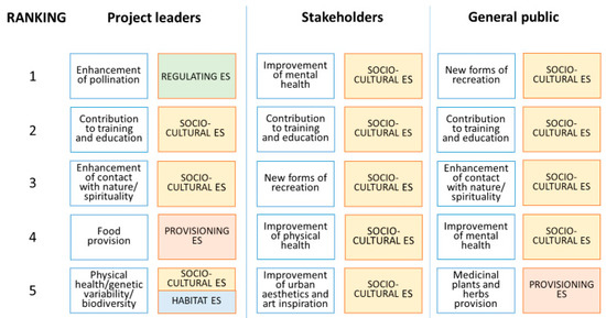 At the UA level, the two other societal groups (UA stakeholders and the general public) agreed about some aspects. In line with the UA project leaders, socio-cultural ESs were ranked higher than environmental ESs. Among socio-cultural ESs, the role of UA in relation to education and training, recreation and mental health was highlighted. The contribution of UA to enhance the contact with nature and spirituality revealed divergences between these two groups. Regarding environmental ESs, both groups agreed on the limited contribution of UA to the enhancement of carbon sequestration and the limitation of extreme weather events, thereby highlighting the perceived narrow role of UA in climate change mitigation and adaptation. The main counter perceptions arose regarding the provisioning ESs, more highly valued by the general public (showing statistical difference for all individual provisioning ESs, Table A1 in Appendix A), and socio-cultural ESs, which were on average more appreciated by UA stakeholders although statistical difference was found for only one of the twelve individual socio-cultural ESs (Table A1 in Appendix A). A summary of the five highest ranked ESs according to project leaders, stakeholders and the general public is displayed in Figure 1.