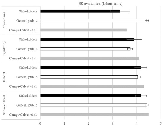 Focusing on the way each individual group evaluates the different ES categories, some statistical differences can also be observed. Firstly, stakeholders valued three ES categories higher than provisioning: socio-cultural (p = 0.000), habitat (p = 0.001) and regulating (p = 0.011). Other differences were not statistically significant. Secondly, the general public valued provisioning ESs in a different way—i.e., higher than habitat and regulating ESs (p = 0.000 in both cases). With a similar average value, socio-cultural ESs are perceived more positively than regulating and habitat ESs (p = 0.000 in both cases). Regulating ESs were the lowest valued type of ES, showing a significant difference also to habitat ESs (p = 0.000). Comparing this to the literature, the stakeholders group showed a similar trend to Camps-Calvet et al. [28], who also focused on stakeholders rather than the general public.