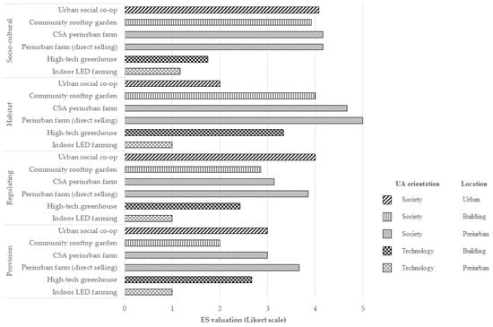 Considering the four groups of ESs (Figure 3), habitat and socio-cultural ESs were valued with higher scores as compared with provisioning and regulating ESs. Regarding habitat services, the highest perceived contributions were associated with the assessed peri-urban initiatives (3.3 on average among case studies). Socio-cultural ESs were similarly evaluated by the socially oriented UA initiatives, the valuations of which were almost four times higher when compared to technologically oriented ones (Table A2 in Appendix A). From a case study perspective (Figure 3), social initiatives obtained the higher valuation of ESs, ranging from 3.4 to 4.1 on average. The peri-urban activities were the ones obtaining the highest valuation on average. These activities had the largest area of cultivation and, thus, a higher impact on the environment in absolute terms as could be perceived by the project leaders. On the contrary, the indoor LED farm was the one scoring as the lowest ES out of all the types (average of 1.1).