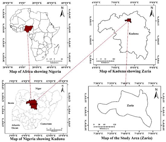 Zaria is the second largest urban center in Kaduna state, Nigeria, after Kaduna, the state capital. The urban center comprises Zaria and Sabon Gari Local Government Areas (LGA). The statistics of Nigeria’s 2006 population census estimated Zaria’s population to comprise the two LGA agglomerations that make up the city. It has approximately 698,348 inhabitants, with Zaria and Sabon Gari LGAs having 406,990 and 291,358 inhabitants, respectively []. Butler [] identified the urban center as one of the most populated cities in Nigeria, ranked as the eighth and the only non-state capital amongst the top 10 largest urban areas in Africa’s most populous country, Nigeria. The city is located on the central plain of northern Nigeria at an altitude of 670 m above the mean sea level (MSL). It lies between latitude 10°55′0″ S to 11°5′0″ N and longitude 7°30′50″ W to 7°50′0″ E, as depicted in Figure 1. The city is characterized by slopes less than 4°, except for inselbergs and lateritic mesas, which tower between 30 to 45 m high above the surrounding plains []. The city is approximately 250 km to Nigeria’s capital city, Abuja, and about 150 km to northern Nigeria’s commercial nerve city, Kano. It has a tropical continental climatic condition characterized by two distinct seasons, the dry season experienced between October and May and the rainy season experienced between June and September. The city’s average monthly climatic values during the dry and rainy seasons include rainfall ranging between 24.6 mm and 213.8 mm, and minimum and maximum temperatures ranging between 14.1 °C and 19.5 °C []. The natural vegetation is of the Guinea Savannah type, and has long been altered by various human activities that include deforestation, overgrazing, and construction activities, among others [].