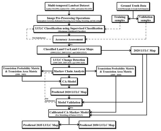 The methodological approach employed in this study was sub-divided into 5 stages. These stages are as follows: (i) pre-processing of satellite data, (ii) image classification, (iii) accuracy assessment, (iv) land use/land cover change detection, and (v) modelling and prediction of LULC using the CA–Markov model. Figure 2 illustrates the flowchart of the methodology.
