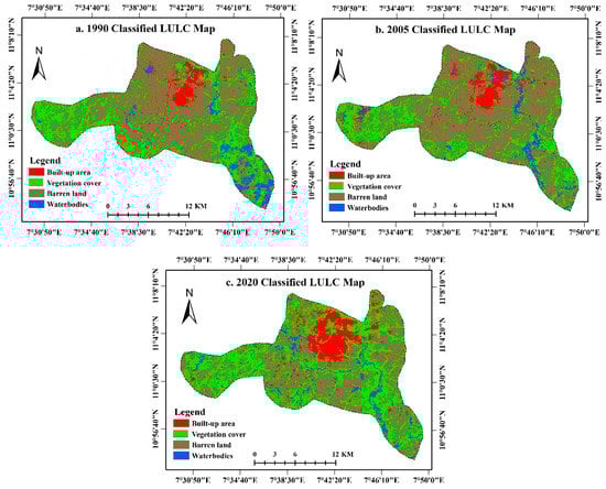 The LULC change analysis results illustrate the historical land use/land cover changes and the change dynamics in each land cover class. The LULC results would significantly help urban planners and decision-makers determine the nature, position, and rate of change in the study area. The classified land use/land cover maps of 1990, 2005, and 2020 were generated using the supervised maximum likelihood classification. The values of the overall accuracies and kappa coefficients for all the classified LULC maps of 1990, 2005, and 2020 were found to be above 80% and 0.75, as shown in Table 3. This indicates a reliable and accurate classification of images for analyzing land use/land cover change.