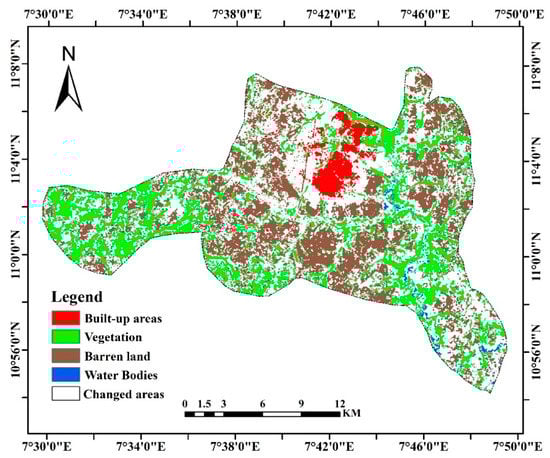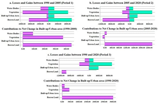 The result shows steady growth in the city’s built-up area and significant changes in other LULC classes between 1990 and 2010. It indicates an increase in built-up area from 1857.51 ha in 1990 to 2784.24 ha in 2005. This is an increase from 4.72% to 7.08% of the total area during the first period (1990–2005). The built area further increased to 5444.55 ha (13.84% of the total area) in 2020, indicating a growth of 2.36% and 6.76% during the first and second periods, respectively. The result reveals an increase from 4.72% of the total area in 1990 to 13.84% in 2020, which indicates the expansion of the built-up area with about 9.12% between 1990 and 2020. The city’s vegetation cover and barren land witnessed an inconsistent change during the study period. The vegetation decreased from 12,937.77 ha in 1990 to 11,606.94 ha in 2005 and increased rapidly to 18,209.25 ha in 2020. This indicates an increase from 32.89% of the total area in 1990 to 46.29% in 2020. The growth in Zaria city’s built-up area and vegetation cover can be attributed to the city’s rapid increase in population due to rural–urban migration and the increased demand for agricultural produce that contributes to the rise in cash crop farming. The barren land increased from 22,298.13 ha in 1990 to 23,152.77 ha in 2005, and decreased drastically to 13,674.87 ha in 2020. The result indicates a decrease from 56.68% of the total area in 1990 to 34.76% in 2020. The water bodies in Zaria city did not witness much change during the entire study period; it decreased from 2247.03 ha (5.71% of the total area) in 1990 to 2011.77 ha (5.11% of the total area) in 2020. The historical land use/land cover results in 1990, 2005, and 2020 are illustrated graphically in Figure 4. Change analysis was further conducted using the LULC maps of 1990, 2005, and 2020 to demonstrate the losses and gains in each land cover class during the three-time nodes. The change analysis result clearly shows both losses and gains in all LULC classes during the different study periods.
