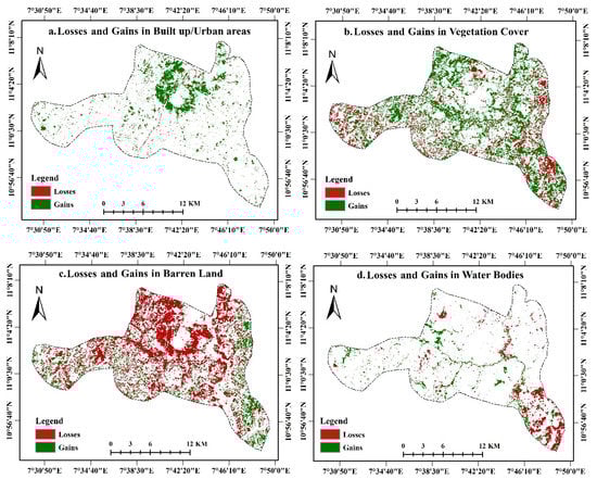 During the third phase between 1990 and 2020 (i.e., period 3), the built-up/urban area lost 254.34 ha (−13.69%) and gained 3841.38 ha (70.55%), witnessing a net gain of 3587.04 ha (65.88%). Vegetation cover lost 4170.30 ha (−32.23%) and gained 9441.81 ha (51.85%), witnessing a net gain of 5271.48 ha (28.95%). Barren land lost 11,616.75 ha (−52.10%) and gained 2993.49 ha (21.89%), having a net loss of 8623.26 ha (−63.06%). Water bodies lost 1938.87 ha (−86.29%) and gained 1703.61 ha (84.68%), having a net loss of 235.26 ha (−11.69%). The different LULC classes that added to the net gains in built-up areas during the period 1990 and 2020 include the transfer of 3014.82 ha (13.52%) of barren lands to built-up areas and the conversion of 421.02 ha (3.25%) of vegetation and 151.20 ha (6.73%) of water bodies to built-up areas. Similarly, 5321.07 ha (23.86%) of barren land and 371.43 ha (16.53%) of water bodies changed to vegetation cover during this period. The LULC change analysis demonstrated considerable changes and transitions observed among the different LULC types. It indicates the built-up area to have experienced the most remarkable change in the last 30 years between 1990 and 2020. This study presents the different gains and losses in each land use/land type (in hectares) and the net change additions to built-up areas (in hectares) during periods 1, 2, and 3 in Table 5 and Figure 5. The spatial changes in the four LULC classes and the unchanged areas during the study period are shown in Figure 6 and Figure 7.
