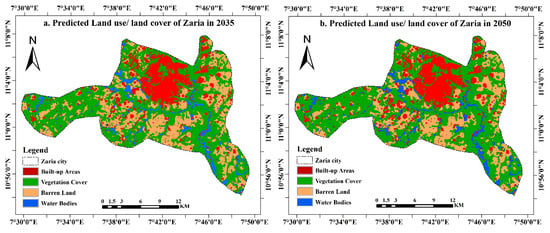 We employed the integrated CA–Markov model and satellite-derived land cover maps to model the future spatial and quantitative LULC scenarios in Zaria city, Nigeria. However, the model’s validation is necessary to evaluate the simulation process’s consistency in terms of quantity and location []. The transition area files for the years 1990–2005 were used to model the 2020 LULC map. The simulated 2020 land cover map was then compared with the satellite-derived LULC map, which served as a reference map representing the city’s actual ground conditions. This procedure was used to evaluate the validity of the CA–Markov model. The validation module comprises four statistical kappa parameters: the overall kappa, kappa location, kappa histogram, and accuracy percentage []. The overall kappa was utilized in evaluating the model’s overall success, while kappa location was utilized in evaluating the model’s ability to identify location accurately. These values are essential in evaluating the overall accuracy of the simulation model. A kappa statistic of 0% indicates no agreement between land cover maps and their probability, while 100% indicates a perfect agreement. The validation statistics present a kappa no (Kno) value of 0.7698, kappa location (Klocation) value of 0.8336, kappa locationStrata (KlocationStrat) value of 0.8336, and kappa standard (Kstandard) value of 0.6997. The results indicate good kappa index values, verifying the model’s efficiency for future land cover simulations []. Therefore, we used the classified 2020 LULC map alongside the transition probability matrix and the transition area matrix between 2005 and 2020 to forecast the city’s land cover pattern in 2035 and 2050, as shown in Figure 8. The corresponding areas of the modelled land cover classes are presented in Table 7.