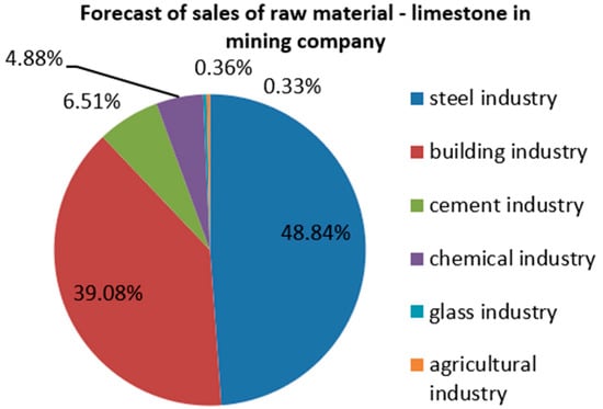 The chosen object of this research was a mining company in Slovakia that deals with the mining of a raw material—limestone. It prepares the raw material, limestone, for various fractions, which it supplies for the construction industry. The mining company produces and sells raw material (Figure 2) for steel, building, cement, chemical, glass, and the agricultural industry. The highest demand of raw material—limestone—is in the steel industry, 49%. In order to expand its portfolio, the mining company must make significant changes in its production process in order to meet the demand for raw materials. This reason is the basic idea of the implementation of the new layout of mining process in the mining company. The mining company uses in the mining process the following equipment: crusher, sorter, three stationary sorting lines, belt conveyors, bigger storage space, tracked excavators, loaders, and exhausting equipment. In this mining process, mobile and stationary machines are used, and this equipment is in the reproduction phase of service life of machines. As the machines are in the reproduction phase, several failures occur, which represents a high cost for the mining company. The company must plan financial resources for new investments in the form of new machinery and equipment, because their functional condition and failure rate is very critical [].