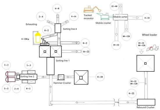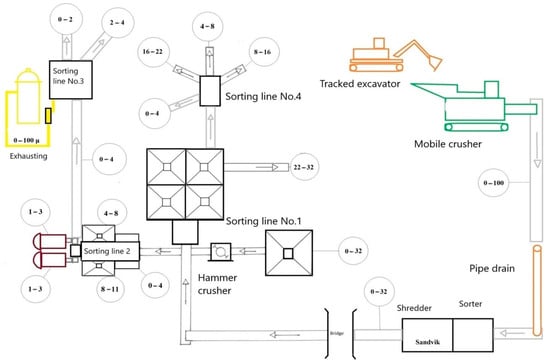 The new suggested stationary production line (Figure 5) for the processing extracted raw material was comprised of the following equipment: mobile crusher, mobile sorter, three stationary sorting lines, belt conveyors, bigger storage space, tracked excavators, loaders, and exhausting equipment. The design of the new production line brought changes in the machinery park of the mining company. The mining company started to use mobile sorters, mobile crushers, which provided a sufficient number of prepared fractions for customers and, thus, satisfied the demand for processed raw materials. These devices have simplified the production process and increased flexibility in the processing of raw materials and the transfer of mobile equipment for sorting lines and storage space. In the mining process, sorting line number 3 was removed, thus removing the belt conveyors; the exhausting device was moved to sorting line number 4; sorting line number 1 was reduced, thus moving the sorting processes to the mobile sorter and mobile crusher.