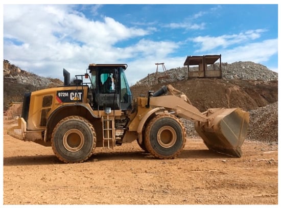 The removal of long conveyor belts increased work productivity as there was no need to move the belt conveyors for the crusher. Mining company Machinery Park has expanded with new wheel loaders (Figure 6), a larger bucket capacity for more efficient loading in comparison with the old wheel loader (Figure 7), new trucks, two Caterpillar crawler excavators with more weight and the associated possibility of a larger bucket volume. The equipment of the mining company’s machinery has increased the flexibility and productivity of the mining and processing process. Changes in the machinery had to be recorded by comparing the technical parameters (Table 2) of the new equipment—wheel loader. More powerful wheel loaders are important in terms of the time interval for loading the truck with raw materials.